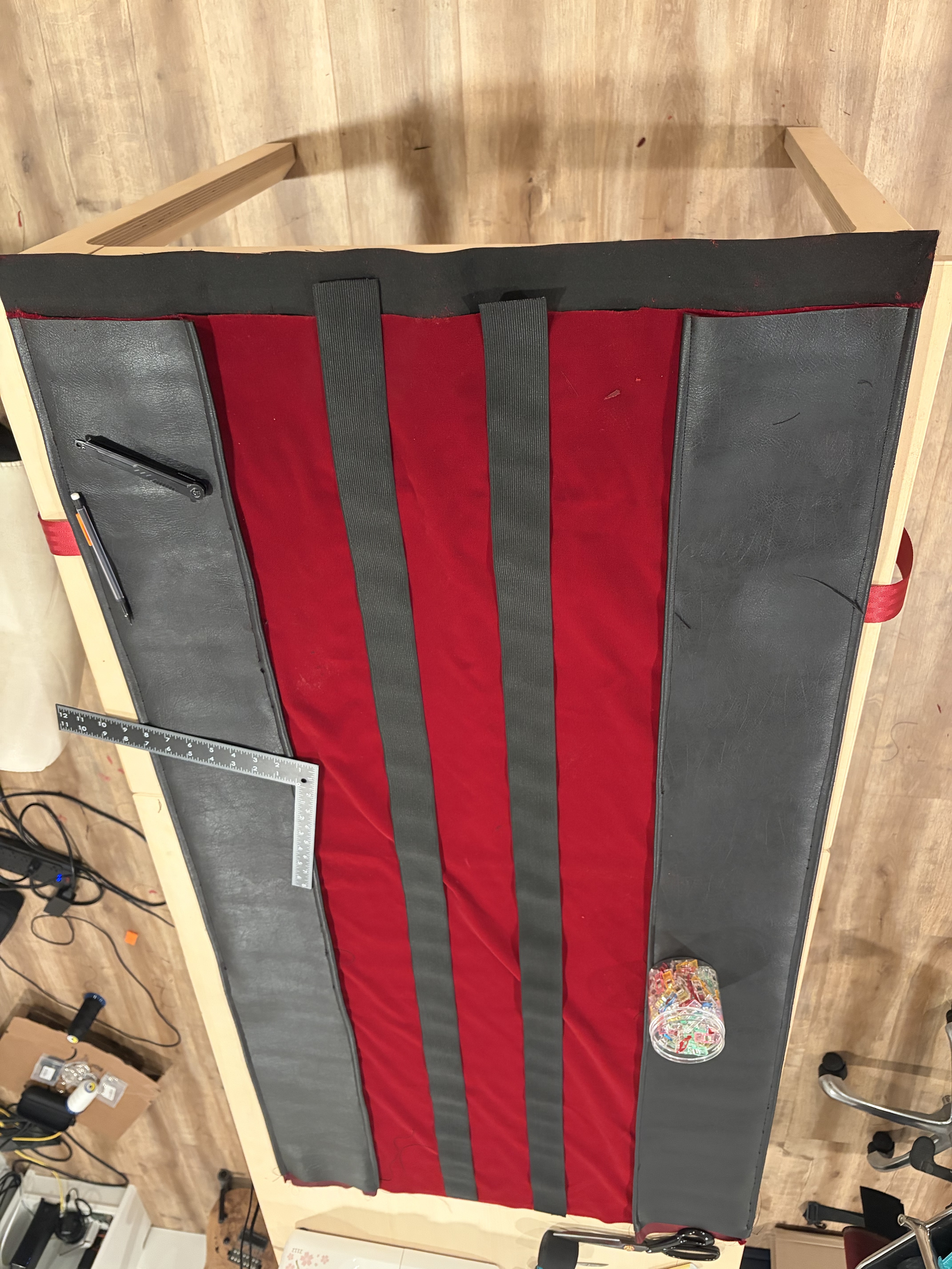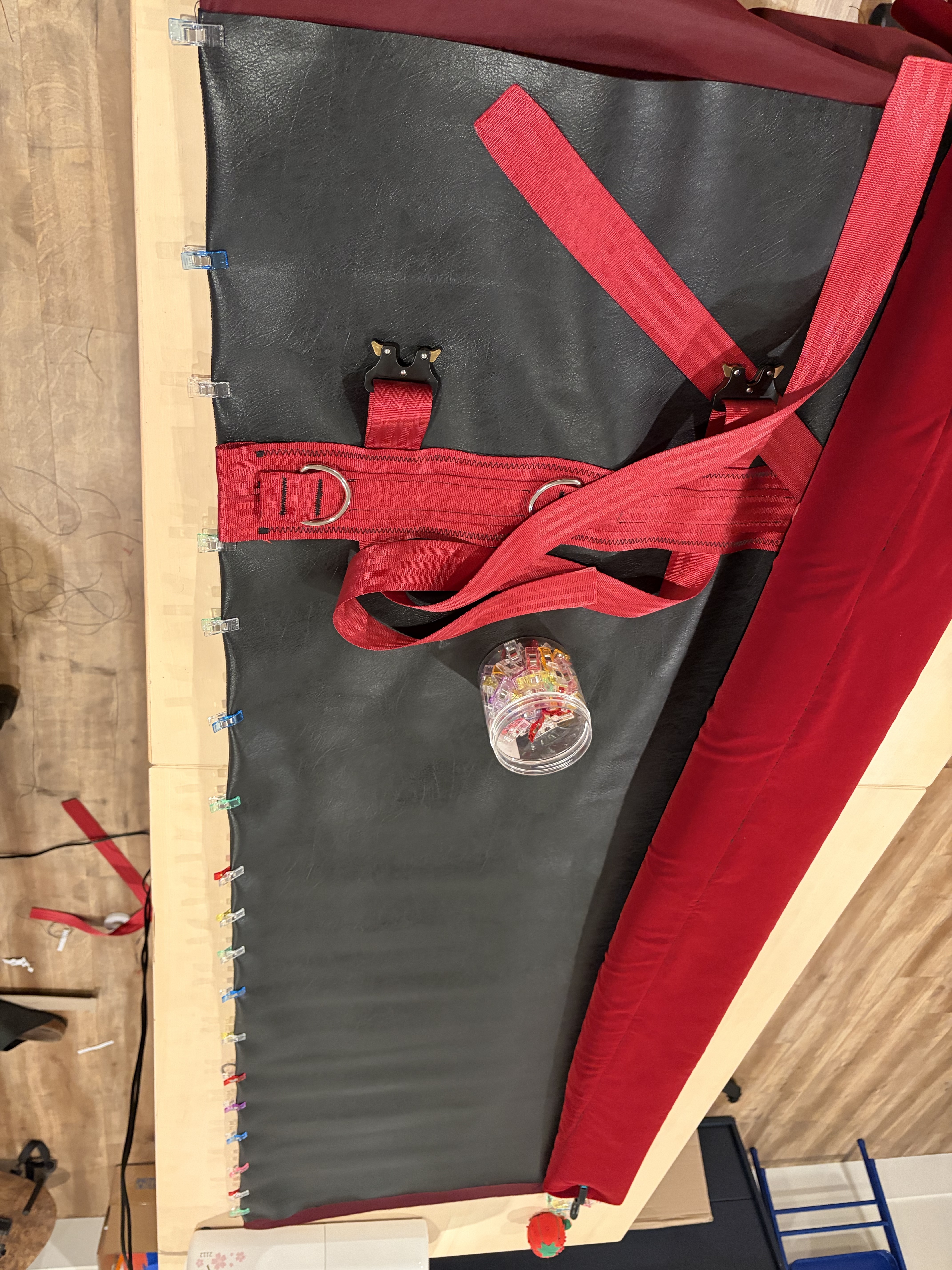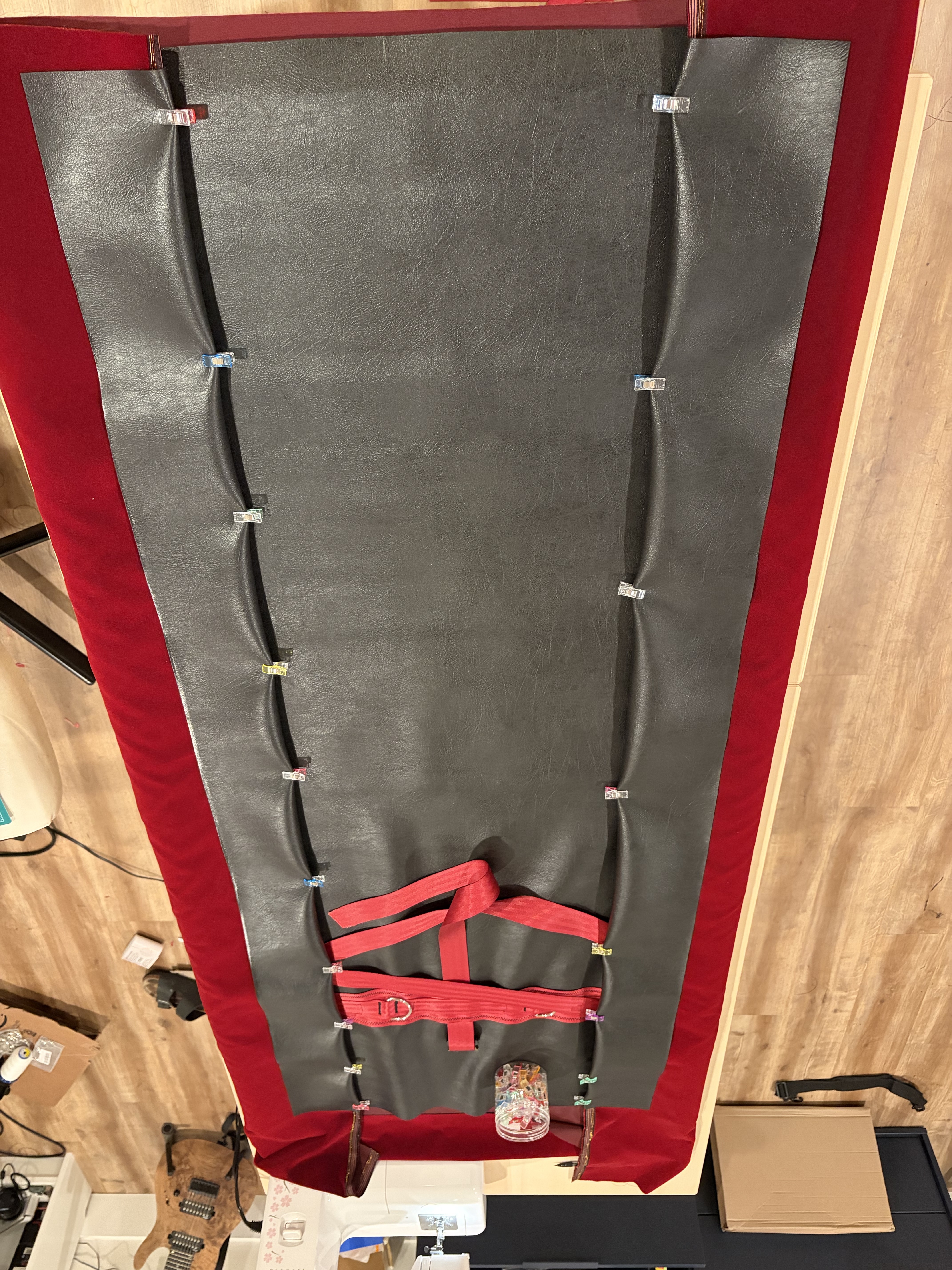 Then, put the assembly on your table, finish attaching the velvet and the leather by folding the leather around the velvet and adding clips. This will help maintain things in place while stitching.