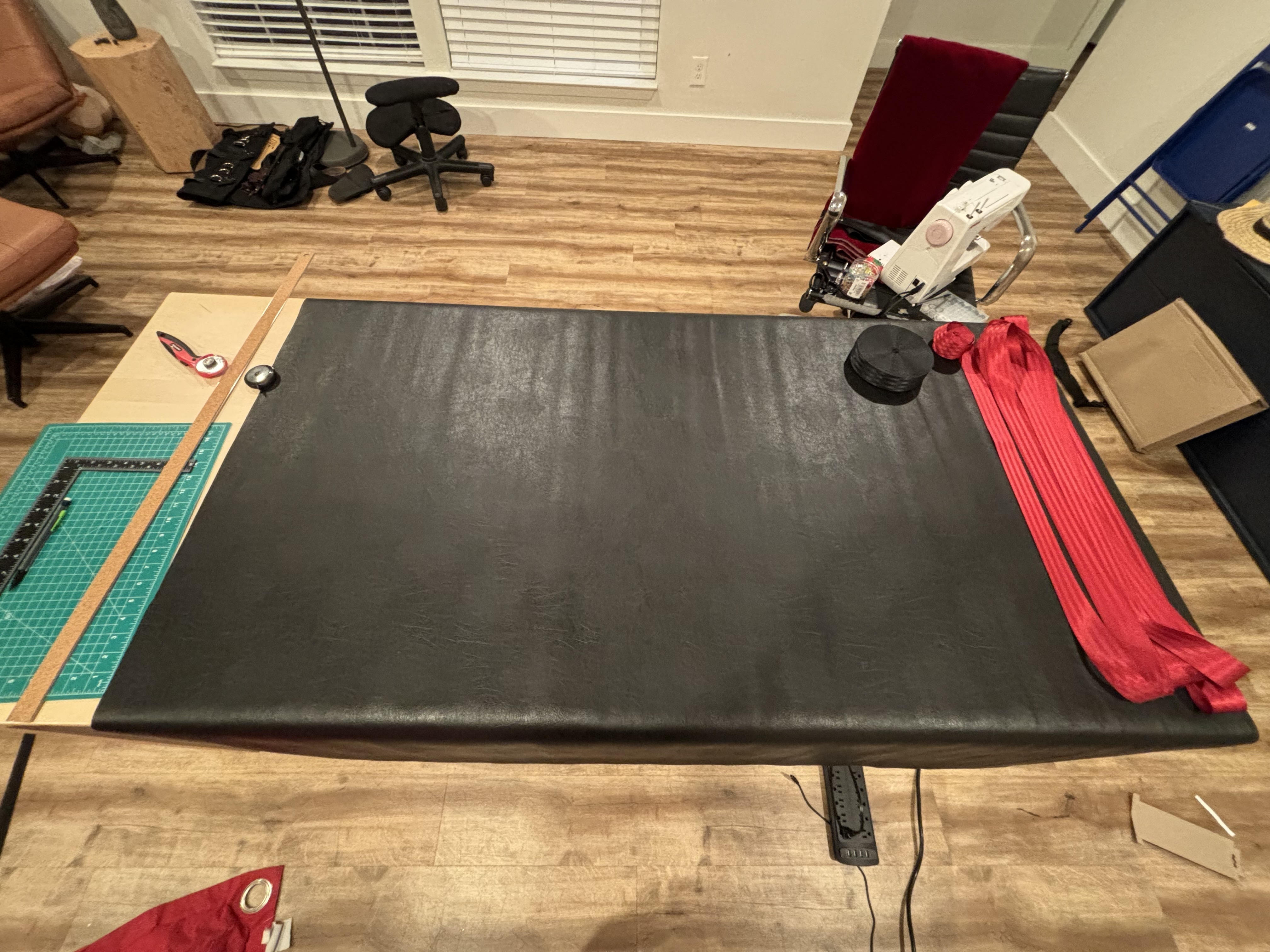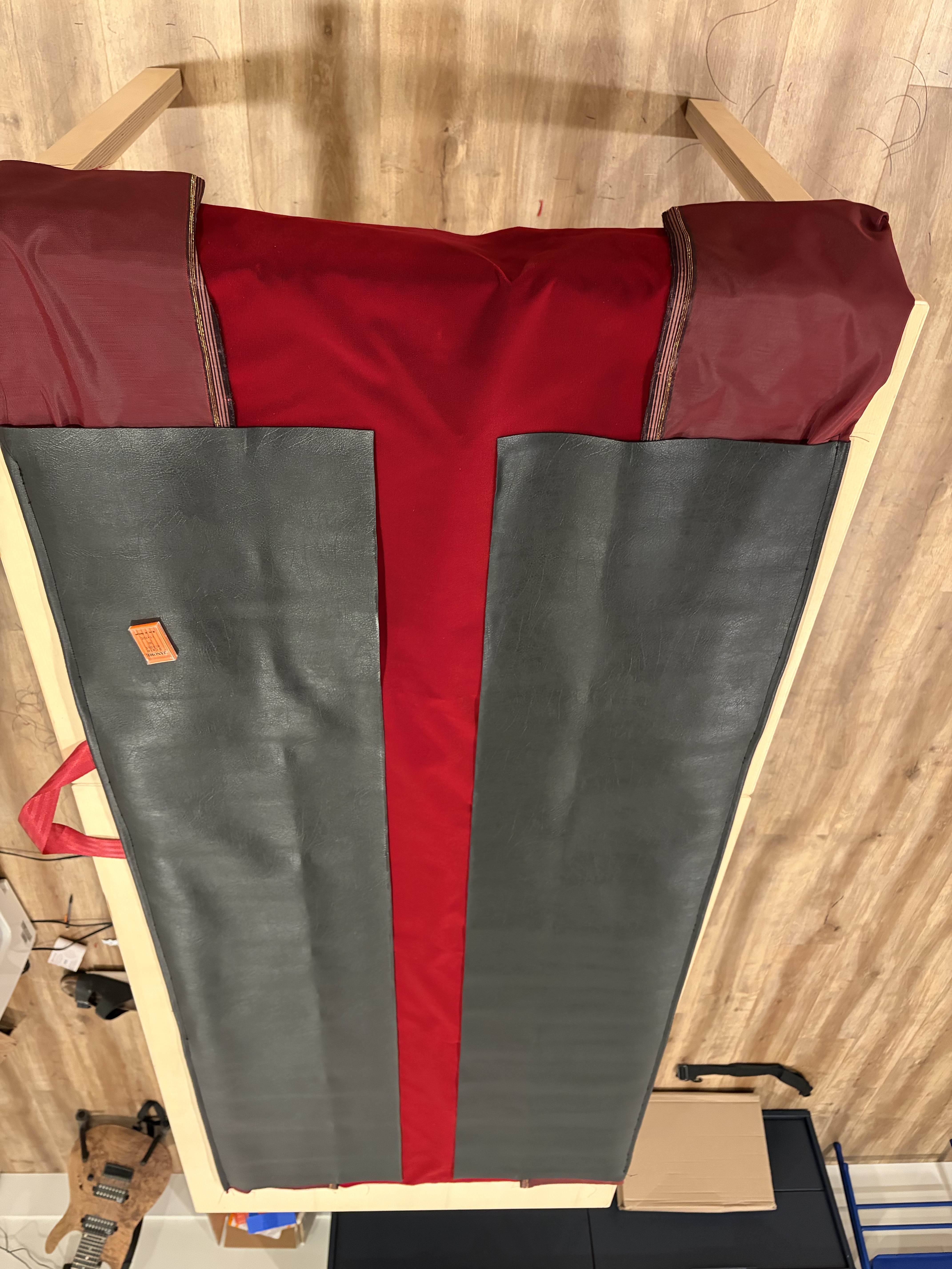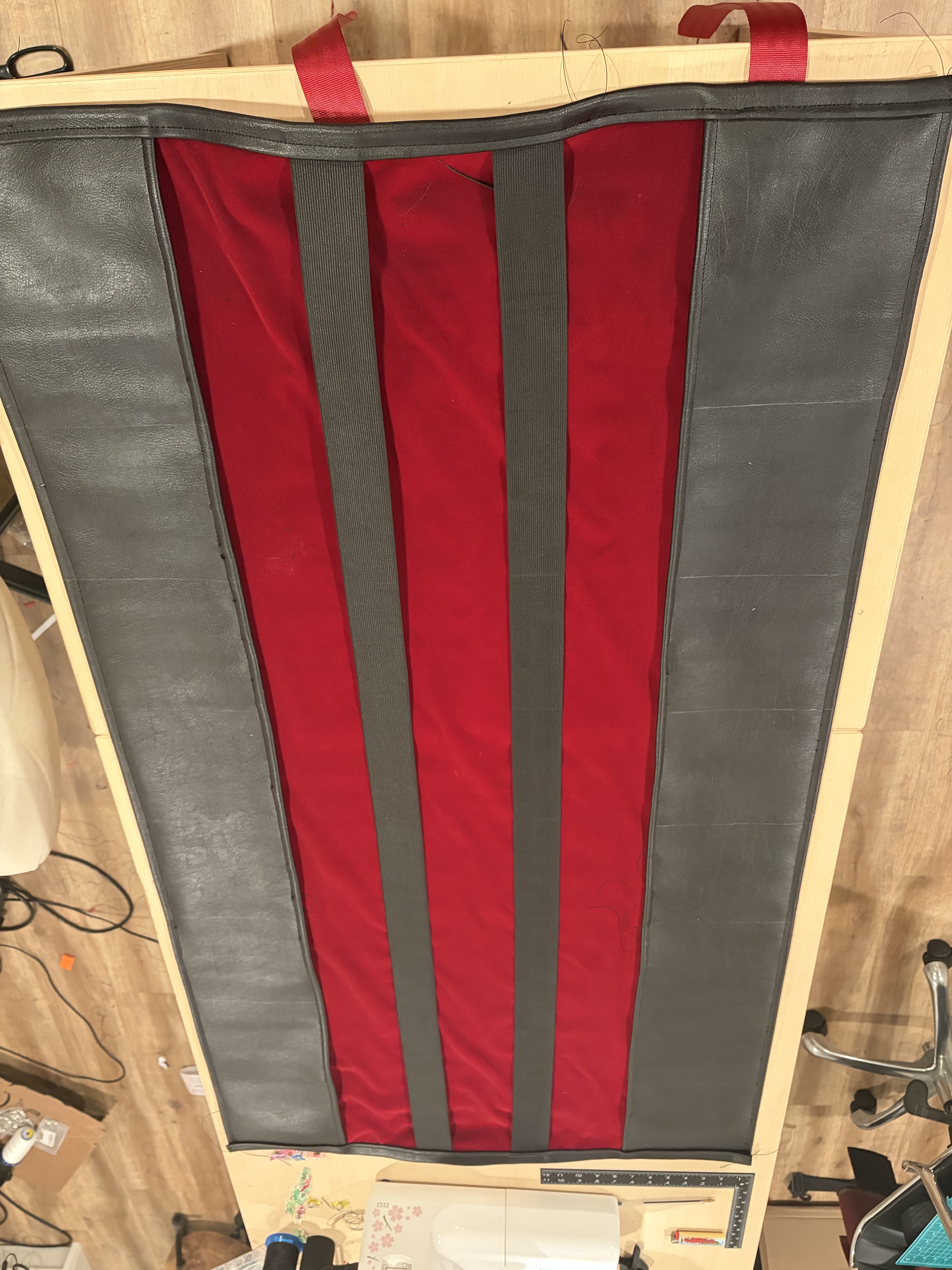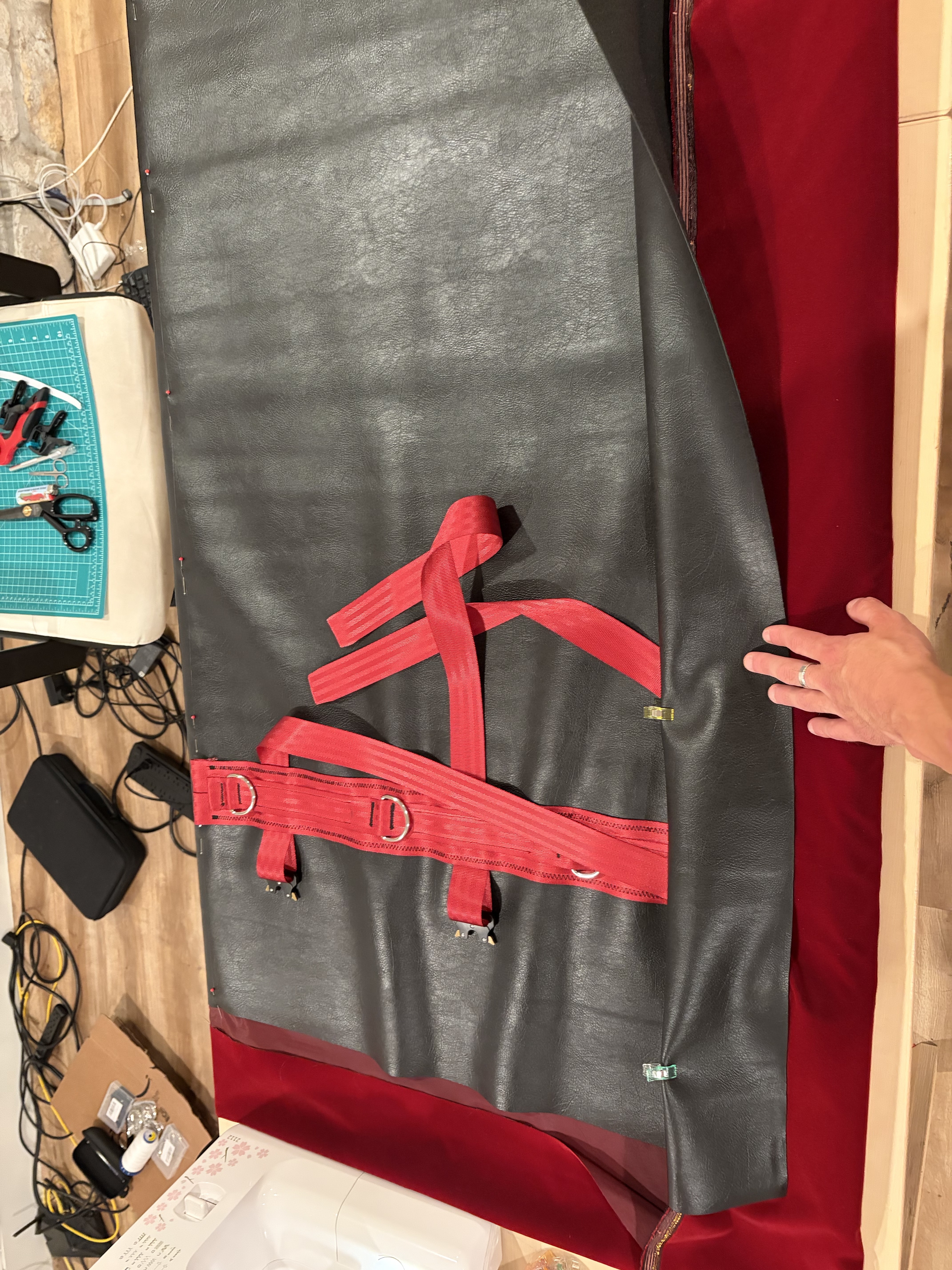 Then, put the assembly on your table, finish attaching the velvet and the leather by folding the leather around the velvet and adding clips. This will help maintain things in place while stitching.