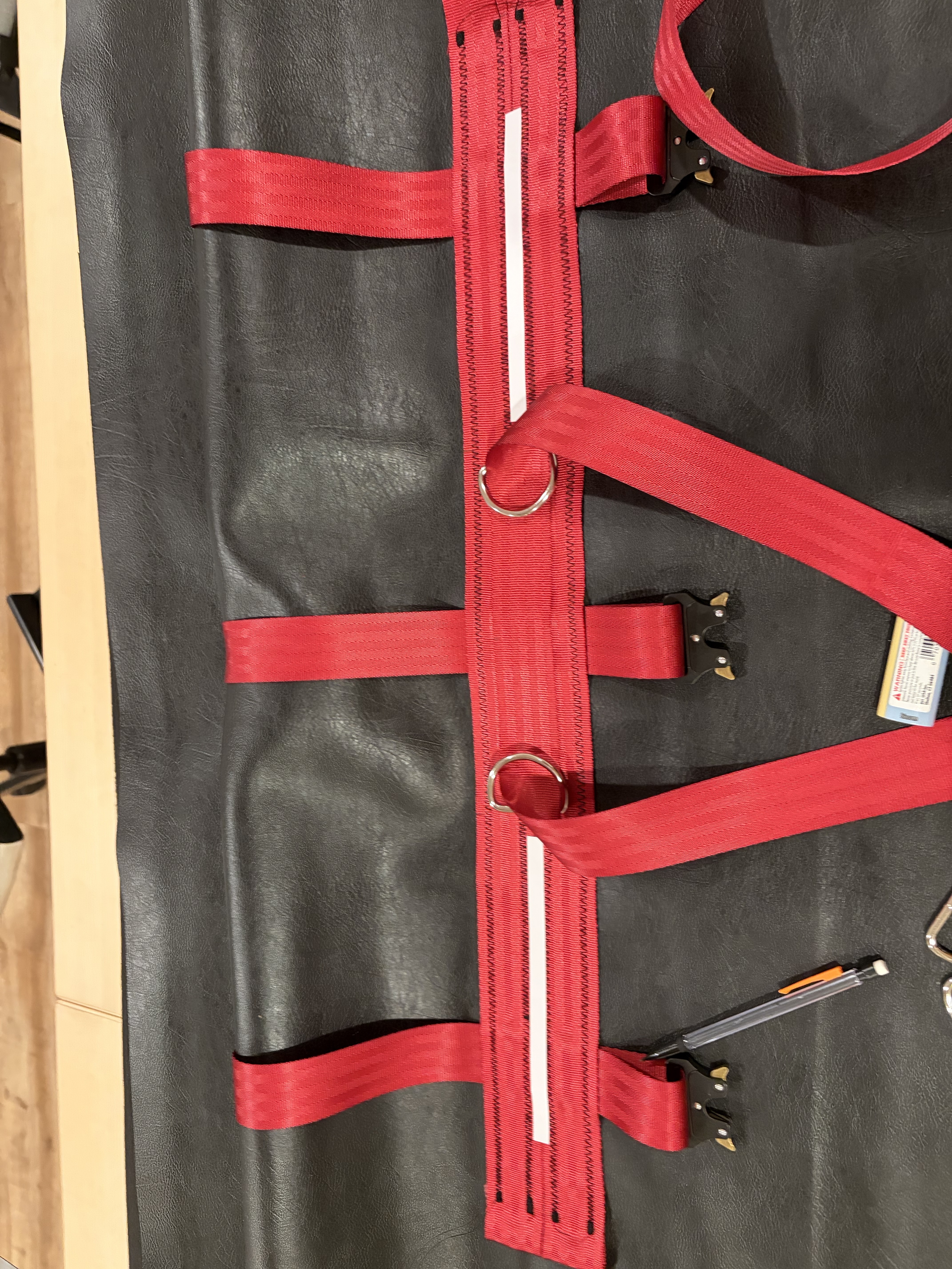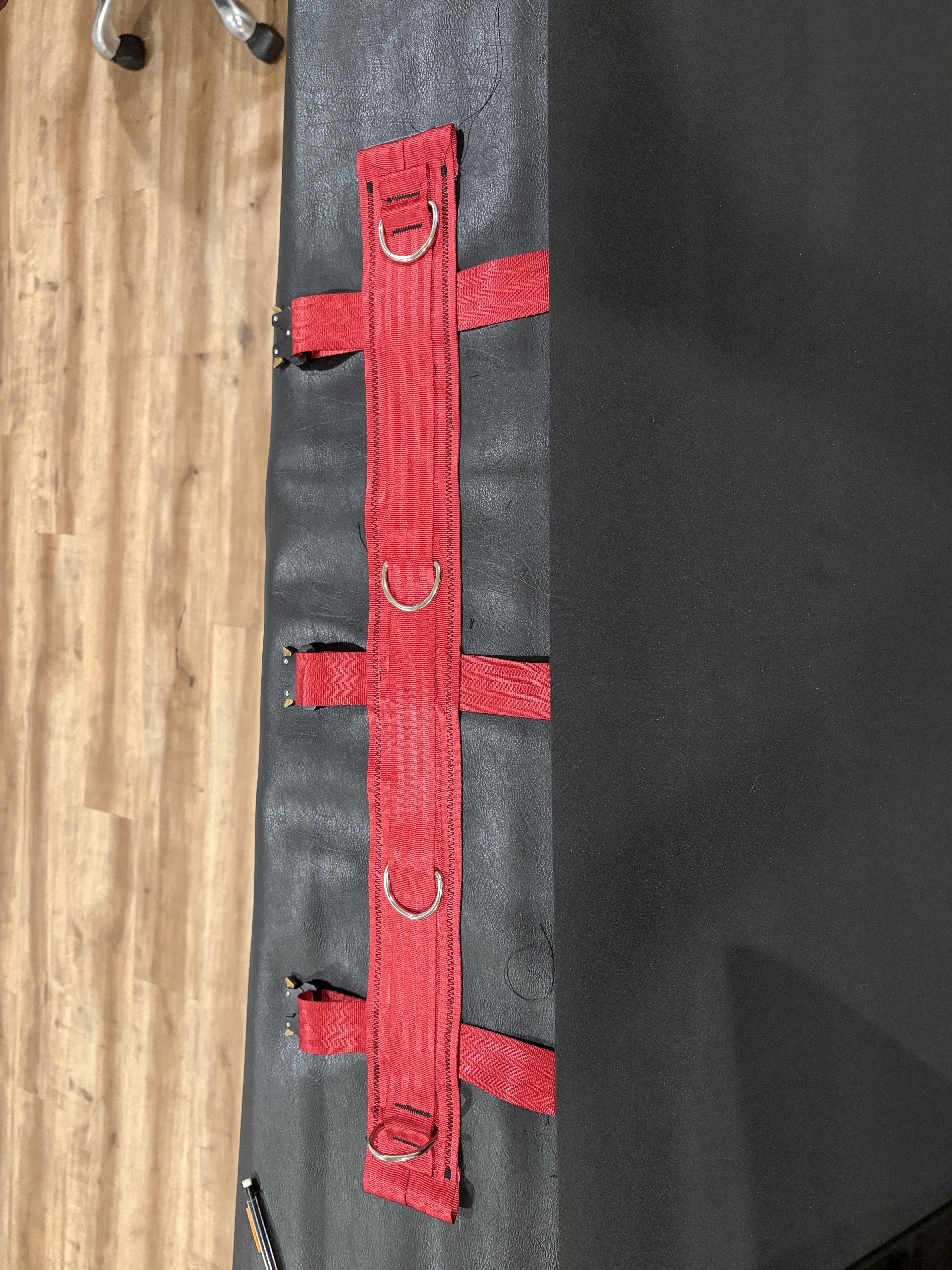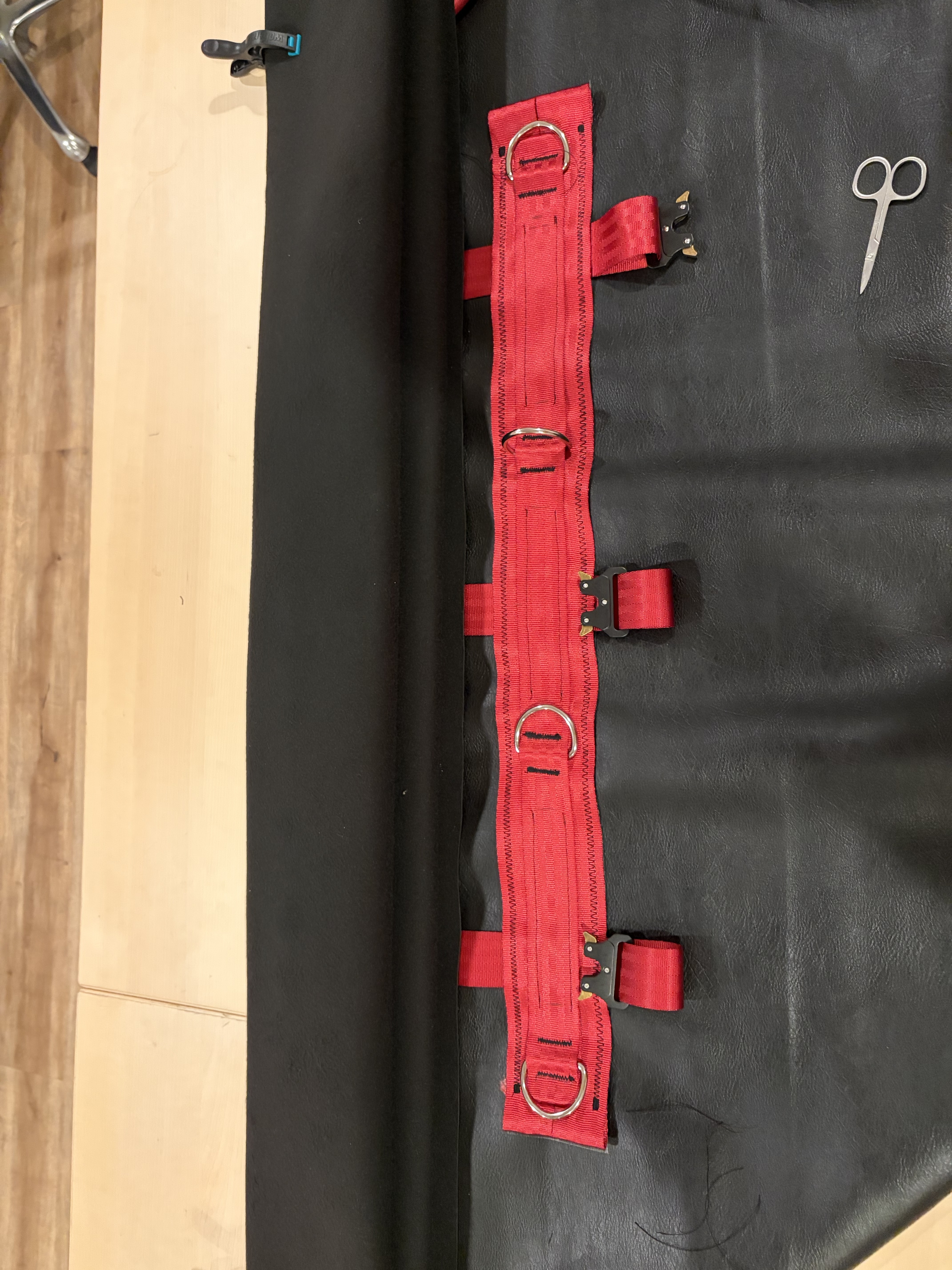 Cut one 32’’ strap which will be placed on top of the two others to hold the D-rings.