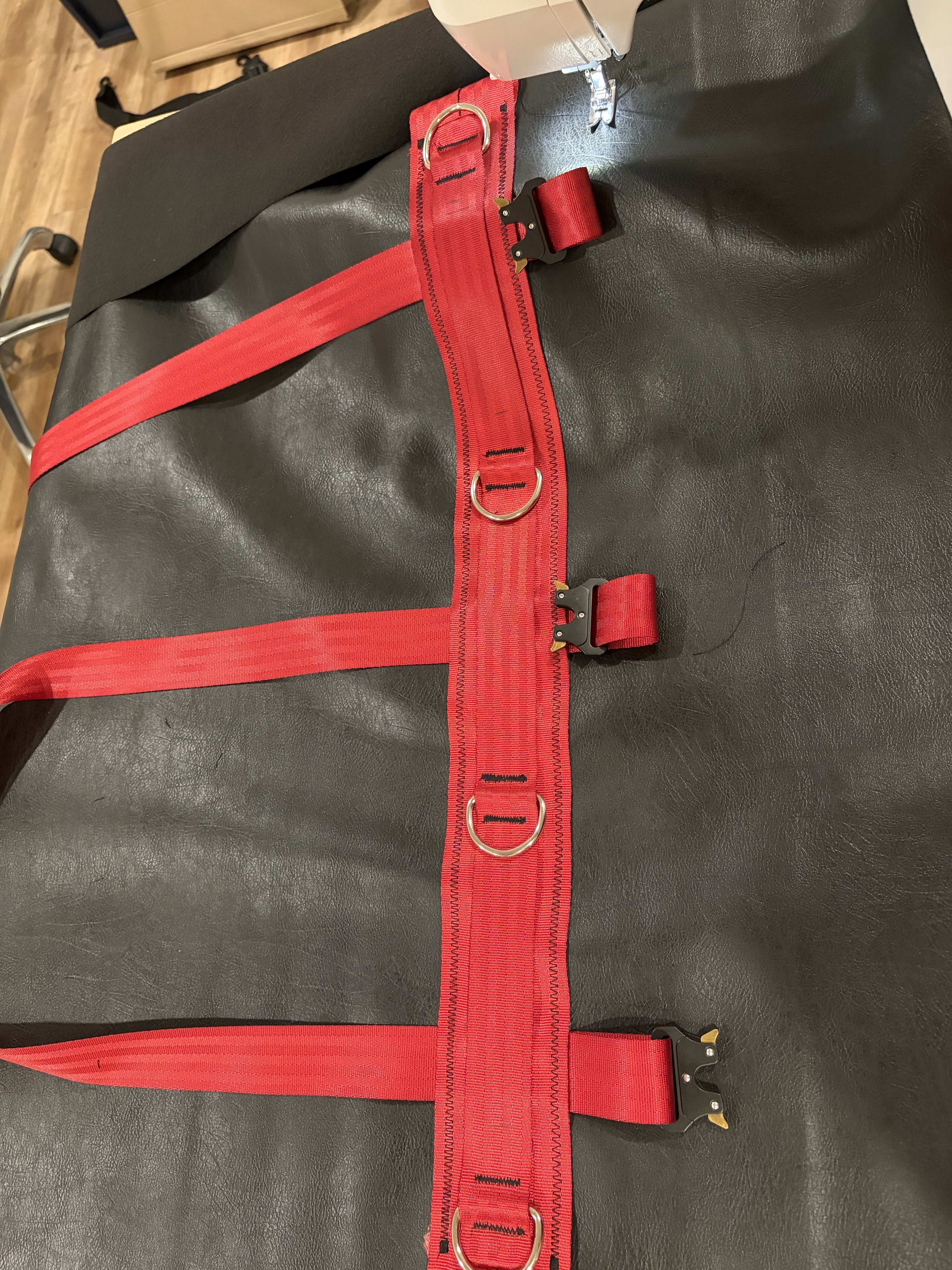 On the picture you can see the final marked rectangle, the three (middle one is on the sewing machine) straps that will close the bag, and the two straps that will be under the D-rings.