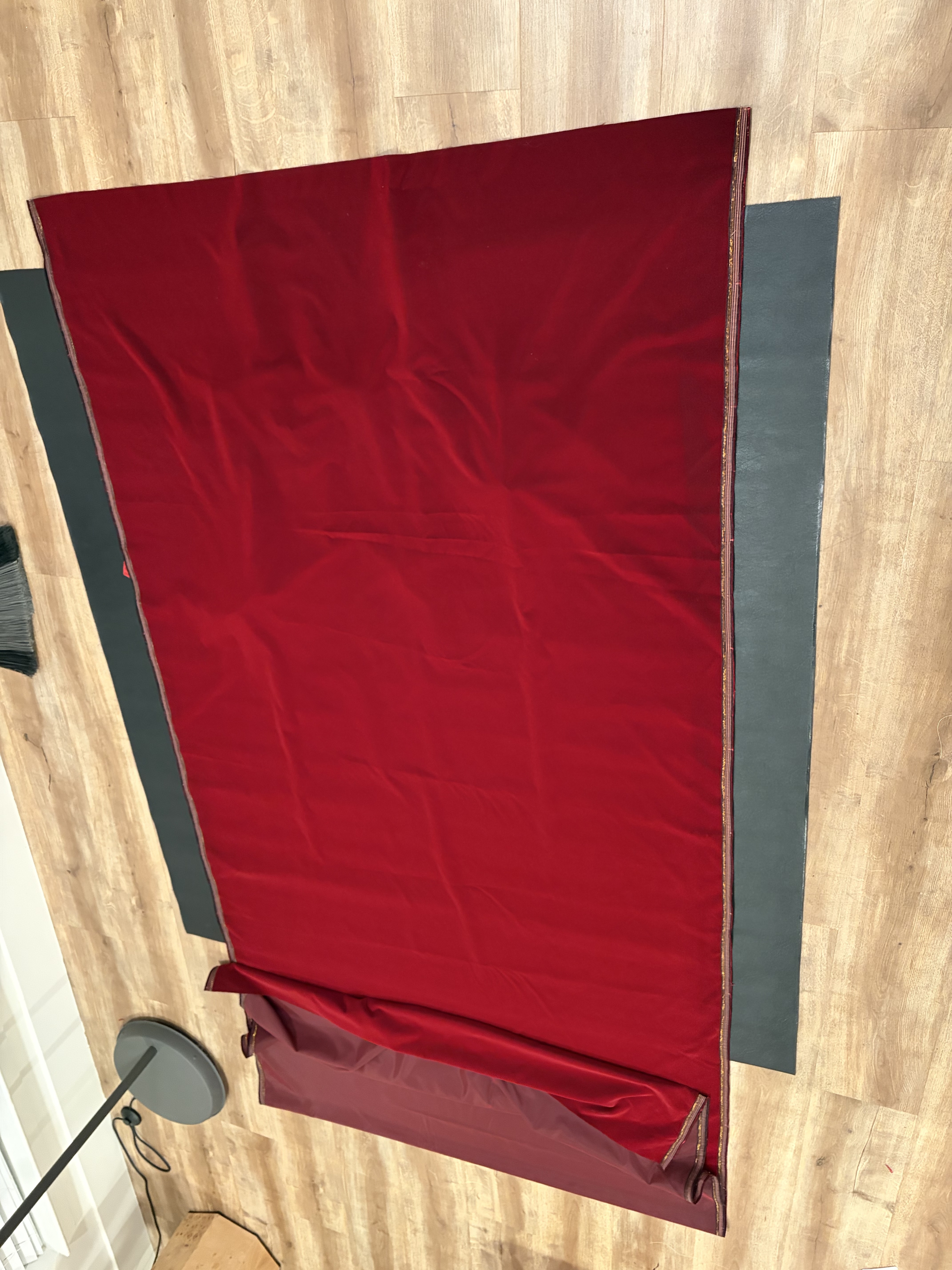 Then, place the velvet on the ground (interior side touching the ground), and place the leather on top of it.