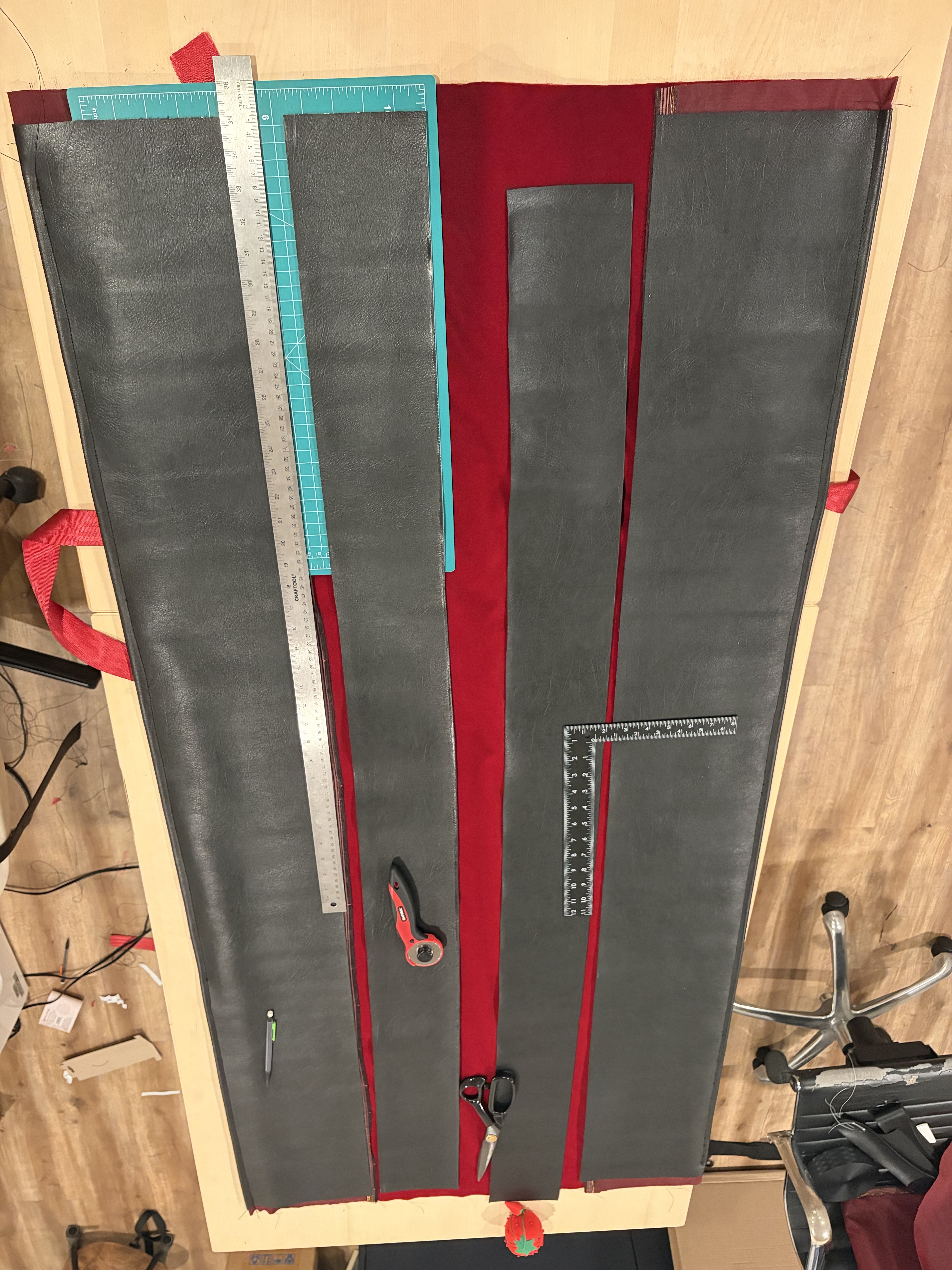 We’ll start by properly aligning the velvet and the leather.